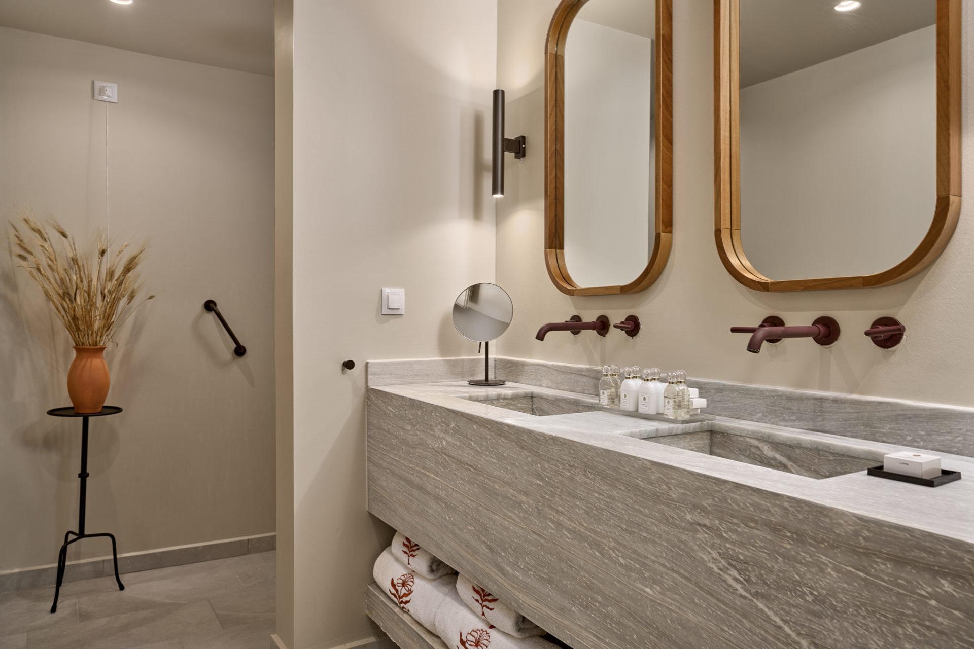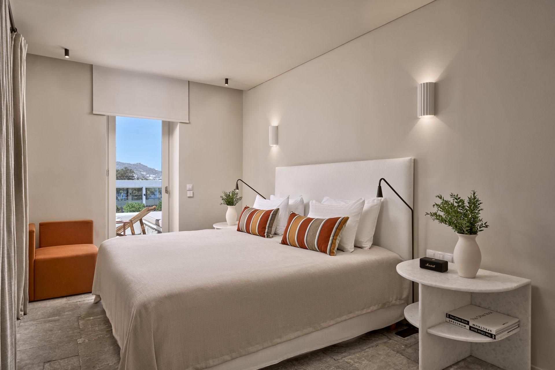 Connect harmoniously with nature overlooking our spectacular gardens. Beautiful décor, soft and sculptural furnishings, natural tones with warm accents of wood, bespoke furniture, and an acute attention to detail, creates this elegantly spacious and airy refuge that redefines the concept of Aegean Chic. Exquisitely appointed, with sumptuous bedding, super-sized king beds, ensuite, marble bathrooms, as well as an extra sofa bed, the Deluxe Suites are an irresistible accommodation choice.