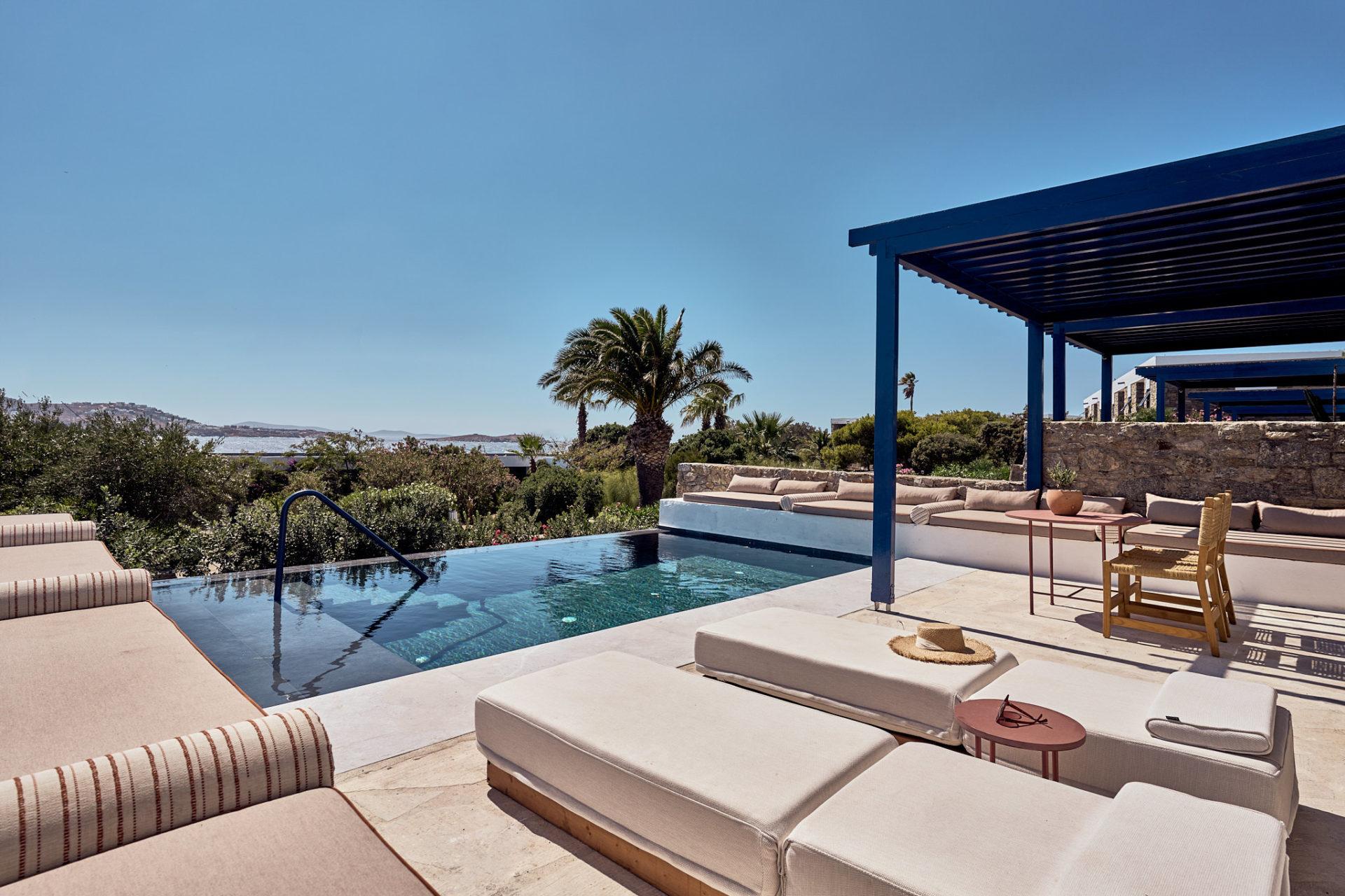 Designed to impress, Theoxenia One Bedroom Suite Sea View with Private Pool offers immersive Aegean views, cutting-edge décor, a spacious outdoor terrace, and a private swimming pool. Blissfully adapted to indoor-outdoor living, it’s a piece of heaven on the property. Treat yourself to a wildly indulgent experience dipping in and out of the pool. Laze on the terrace, invoking the spirit of those long, golden beach days Mykonos is famous for. Spacious and sunny, it features a super-sized king bed as well as a sofa bed, sumptuous bedding, an ensuite marble bathroom, and a wide range of high-end amenities.